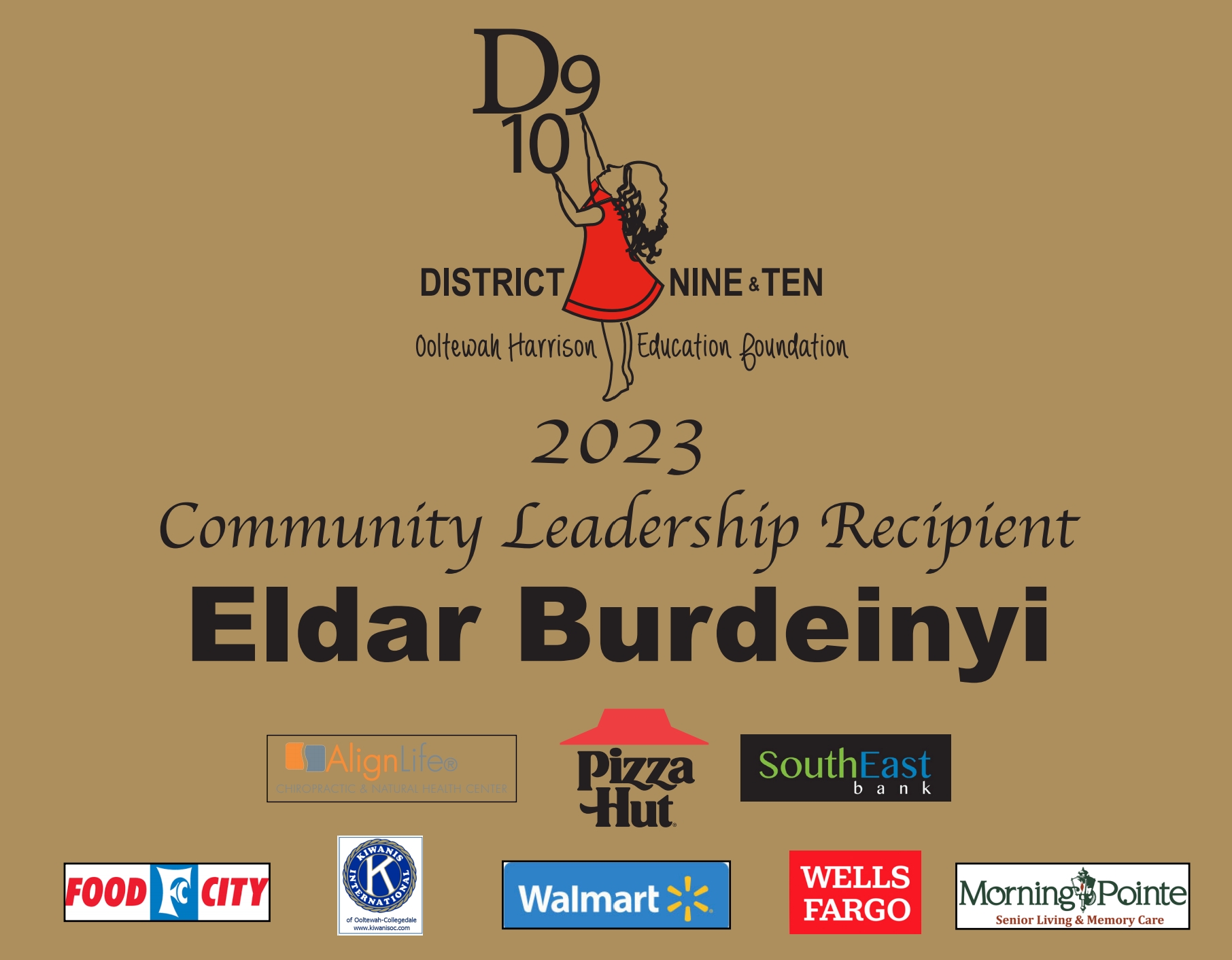 Eldar Burdeinyi, a committed individual, was recognized as the Community Leadership Recipient by the District Nine & Ten Ooltewah Harrison Education Foundation in 2023.