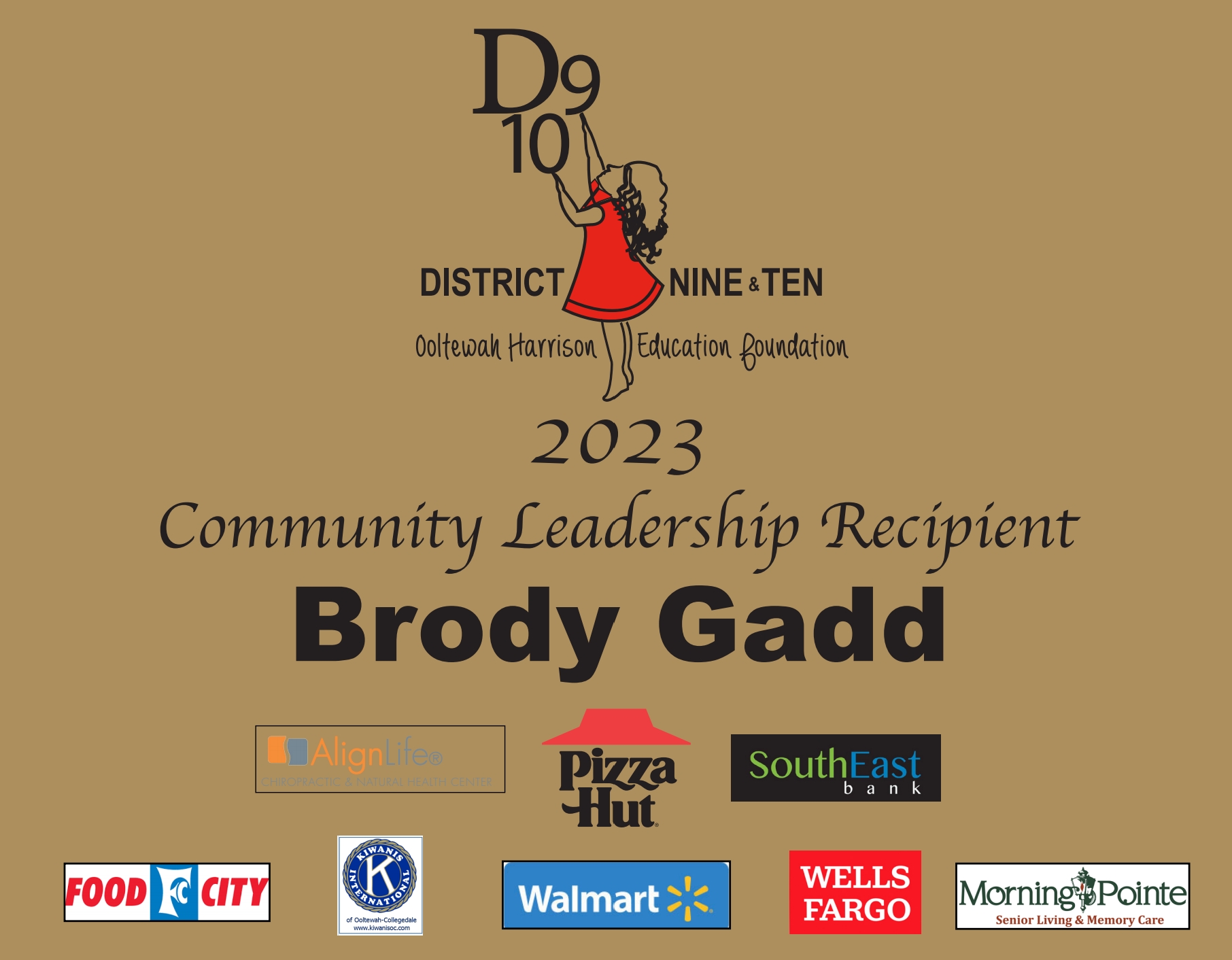 Brody Gadd, a committed individual, was recognized as the Community Leadership Recipient by the District Nine & Ten Ooltewah Harrison Education Foundation in 2023.
